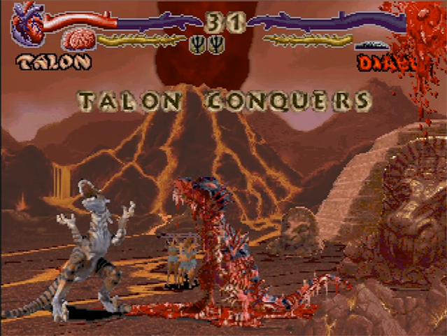 At first glance Primal Rage doesn’t appear to do anything terribly novel with the fighting game formula, but it does them very well. Even though the special attacks use an awkward control scheme, it works much better than Dino Rex. It should also be mentioned that, from a high-level perspective, Primal Rage brought some important evolutions to the genre and actually has some pretty significant depth under the hood. The game was the first to incorporate a damage % in the combo meter, as well as methods to cap combo damage and prevent infinites and other “cheap” tactics. In fact, the game no known infinites or “touch of death” combos to this day! I highly recommend checking out MKK TV’s thread on SRK where he explains some of the finer points of the game and even has some combos videos and matches on his YouTube channel.