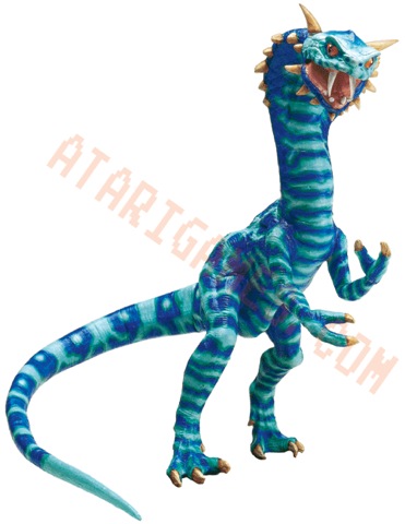 Talon– Talon is a velociraptor-like creature with orange and black striping and white feathers coming out of his head. Official materials paint Talon as a real family man- viciously defending his herd and raising humans as cattle to hunt for sport. Talon is nimble and quick.